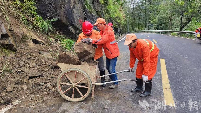在縣域內G346、S229、S238等國省干線重點路段,機械轟鳴、人員穿梭,一派熱火朝天的繁忙景象。“機械+人工”協同作戰:小型裝載機高效清理大塊落石與邊溝淤泥,高壓沖洗車、清掃車接力沖刷清掃路面泥沙雜物;在穿集鎮公路邊溝排水口堵塞處,養護人員手持鐵鍬,俯身深入泥濘溝渠,清掏涵洞深處及溝底堵塞物,疏通排水系統“經脈”,從源頭消除雨后次生災害隱患。另一處臨水臨崖路段,4名養護工人正合力清運邊坡落石,躍動的安全帽與反光服,在青山間勾勒出醒目的“安全色”。從機械作業的“高效推進”到人工處置的“精細兜底”,竹溪養護團隊以全鏈條覆蓋的作業模式,累計投入養護人員60余人次、機械車輛15臺次,已完成80公里邊溝清淤、42處落石清理、7處排水設施疏通,同步修復5處小型路面坑槽等病害。