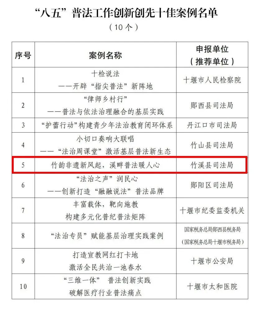 近日,十堰市“八五”普法工作創新創先案例征集活動結果出爐,共評選出“八五”普法工作“創新創先十佳案例”10個、“創新創先優秀案例”15個、優秀組織單位15家,其中竹溪縣司法局申報推薦的《竹韻非遺新風起,溪畔普法暖人心》案例,入選“八五”普法工作創新創先十佳案例。